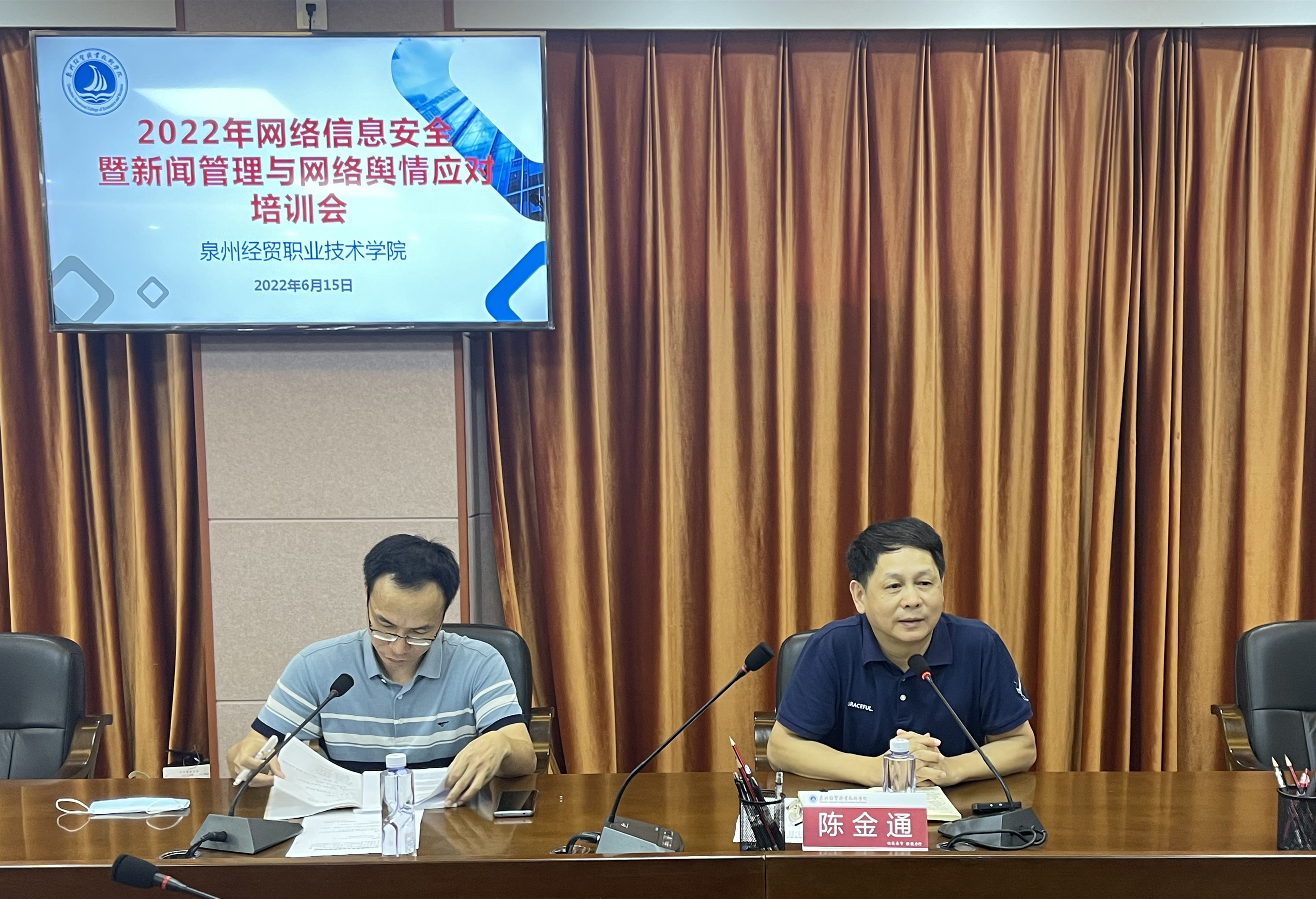 为进一步提升学院网络安全意识,加强网络安全教育宣传,营造安全健康文明和谐的网络环境,2022年6月15日下午,学院在行政楼二楼会议室开展网络信息安全暨新闻管理与网络舆情应对培训会,学院党委副书记陈金通主持会议,各处室、各系部等相关人员参加了会议。