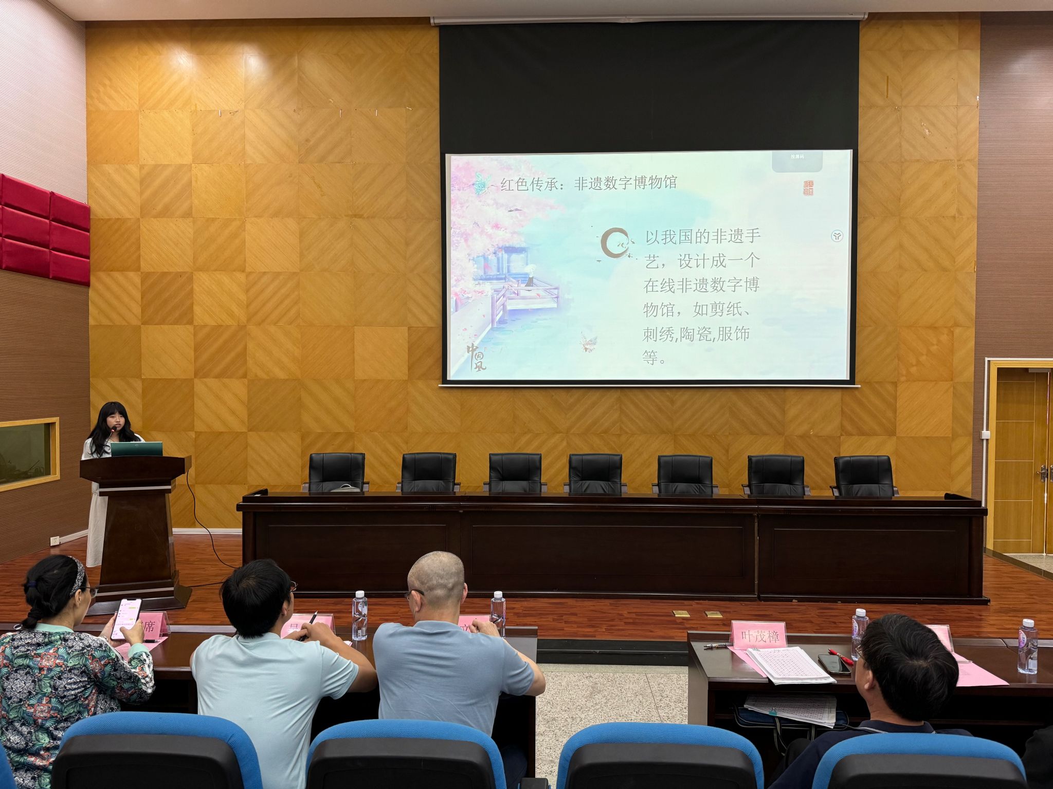 大赛以“红色传承:非遗数字博物馆”“簪花流韵:党的光辉历程可视化”“非遗与党建:共创美好未来”等系列为主题,将非遗项目“簪花围”与互联网技术相结合,同时融入党的元素,以前端设计展示非遗文化和党的光辉历史,在考查学生自主创新意识和程序设计实践能力的同时,也让观看者充分感受文化与科技的深度融合。前期征集作品325份,专家评审后共有17组作品脱颖而出,评选出一等奖2名、二等奖3名、三等奖5名、优秀奖7名。获奖学生代表陈彤、王美晔、郑茂盛、李磊、范志毅先后上台,分别从设计理念、页面布局、技术实现和创新亮点等方面对作品进行细致地演示。